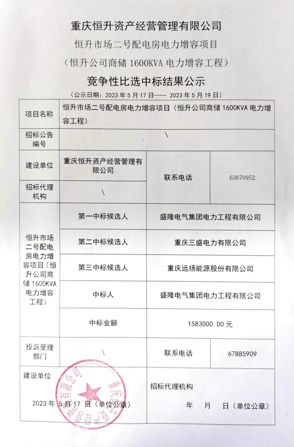 结果公示:重庆恒升资产经营管理有限公司 恒升市场二号配电房电力增容项目 竞争性比选中标结果公示